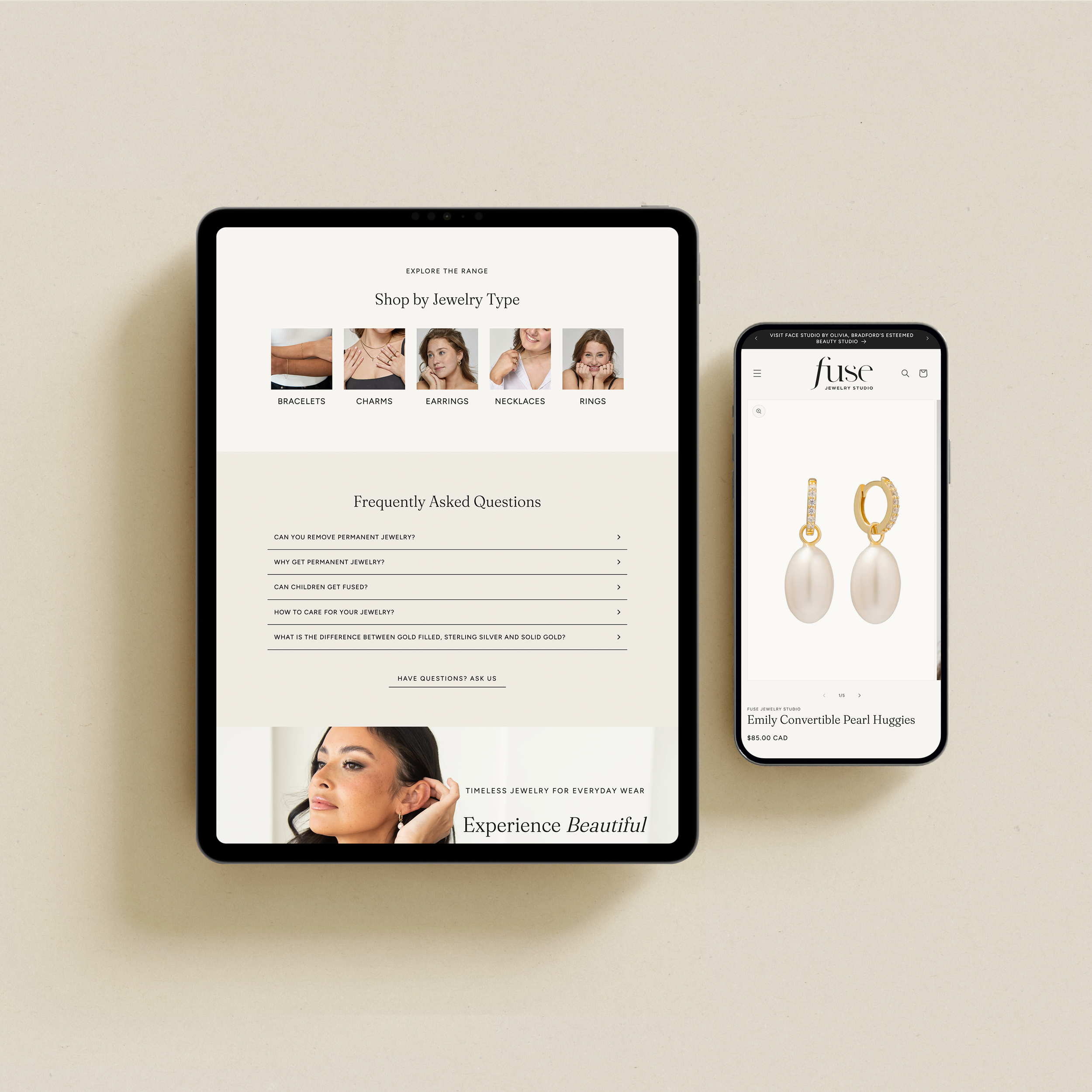 We brought their vision to life by creating a custom logo and brand identity that visually embodies the meaning behind “fuse.” The logo’s connected, seamlessly intertwined letterforms reflect the idea of pieces being bonded together, mirroring both the product and the brand’s creative essence. A warm neutral palette paired with high-contrast accents established an editorial, chic aesthetic that feels elevated and timeless. These choices work together to attract their target audience, offering a luxurious yet effortless brand presence. We launched the business by providing a custom Shopify website that attracts and converts buyers and online shoppers for a permanent jewelry experience.